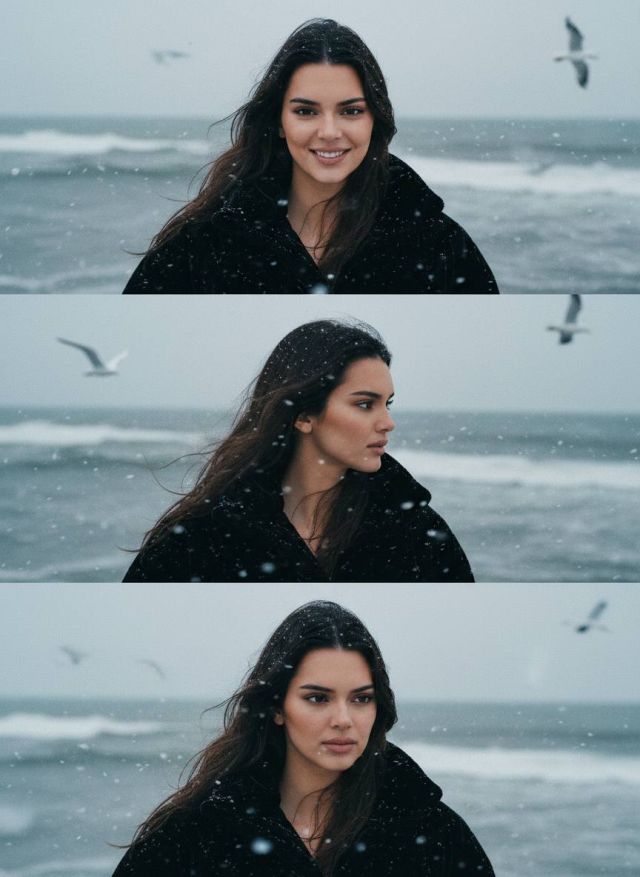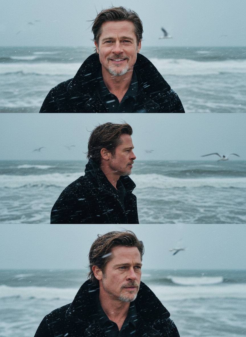 СТРОГО использовать загруженное фото как единственный эталон внешности. Сохранить лицо, кожу, возраст, черты и пропорции 1:1 без изменений. Вертикальный слитный коллаж из трёх горизонтальных кадров без рамок. Локация: зимнее морское побережье. Пасмурно. Холодное серо-синее море, ветер, снег, чайки в воздухе. Одежда: чёрная объёмная бархатная куртка, зимняя, фактурная. Снег на волосах и плечах, влажные волосы, выраженный эффект холода. Кадр 1 (верх): средний план. Мужчина смотрит в камеру, живая естественная улыбка. Ветер и снег в движении. Кадр 2 (центр): профиль вправо. Взгляд на море. снег летит, волны активные. Кадр 3 (низ): крупный портрет, анфас к камере. Серьёзный, задумчивый взгляд мимо камеры (вправо). Видна текстура кожи, снег на волосах, пряди у лица. Фон мягко размытый. Свет естественный зимний, пасмурный. Плёночный эффект: 35mm film, выраженное зерно, мягкий контраст, холодный тон, лёгкая неидеальная экспозиция, ощущение живого кинематографичного кадра. Без текста, без рамок, без глянца.
