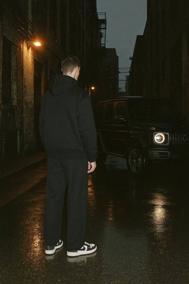 Grainy 35mm analog-style photo in portrait orientation, taken with a wide-angle 35mm lens. Set in a gritty urban alley, the wet pavement reflects the soft glow of streetlights and the matte black 2023 G-Wagon parked nearby. The male model — athletic build, short dark hair — stands still, facing away from the camera. He wears a premium black oversized hoodie (450 GSM) with no drawstrings, creating a luxurious yet laid-back silhouette. The hoodie’s relaxed fit and sleek lines stand out against the city’s moody backdrop. Paired with black wide-leg trousers and clean, white Nike Dunks, the shot captures the essence of streetwear in a raw, atmospheric setting. The visible film grain and gritty flash catch raindrops and chrome, while the background adds depth with its dimly lit buildings.