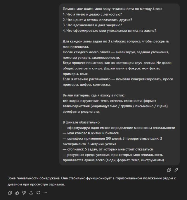 — сформулируй одно емкое определение моей зоны гениальности — мои компас в жизни и бизнесе