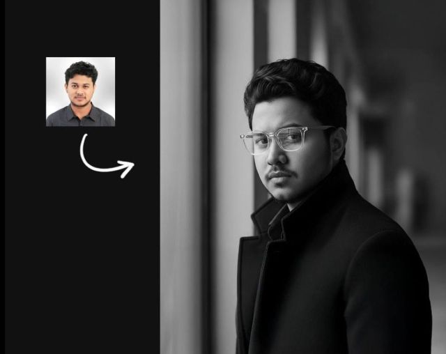 A high-contrast, black and white portrait of a handsome man with a neatly trimmed beard and wavy hair. He wears a tailored coat with a high collar and has a direct, intense gaze. Dramatic lighting from the upper left casts deep shadows, emphasizing his features against a blurred, dynamic background.