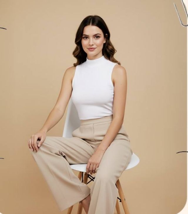 A studio portrait of a woman sitting on a modern white chair against a smooth beige backdrop. She wears a sleeveless, high-neck white top tucked into beige wide-leg trousers.Her posture is poised yet relaxed, with one arm resting on her knee. The setup is minimalistic, with soft, even lighting that highlights her natural features and the neutral tones of the outfit.The overall mood is polished, elegant, and contemporary