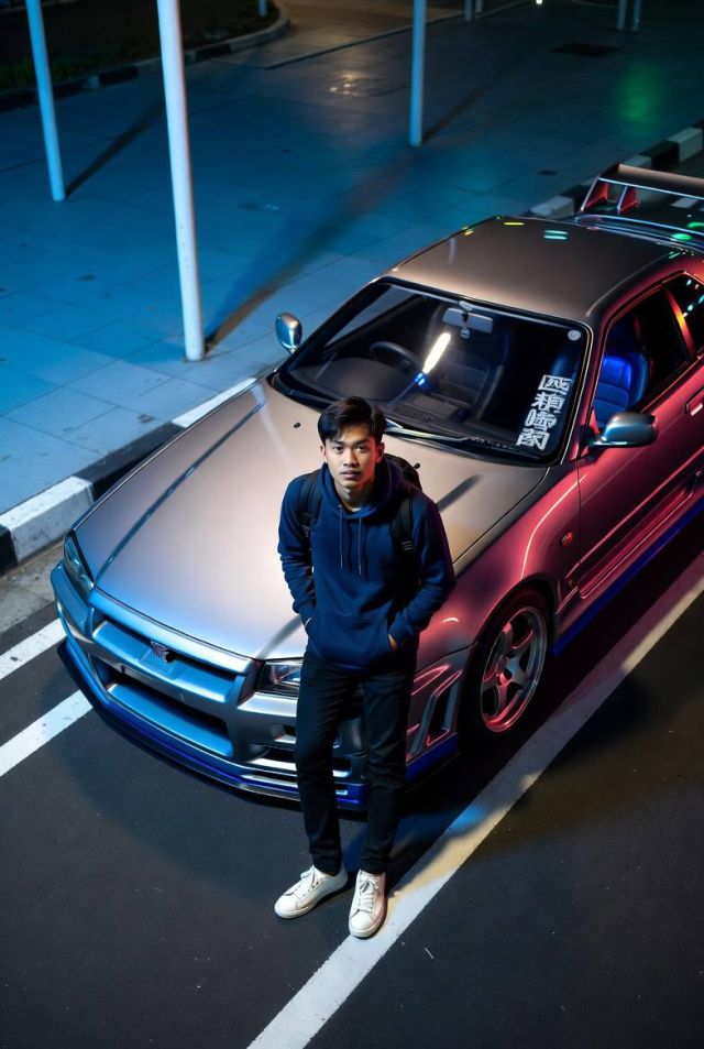 Создайте захватывающее неоновое фото в урбанистическом ночном антураже с атмосферой уличных гонок. Изображение молодого индонезийца, прислонившегося к серебристому спортивному автомобилю, напоминающему Nissan Skyline R34, с синими гоночными полосами и японскими наклейками. Он одет в темно-синий худи, темные брюки, белые кроссовки и черный рюкзак, руки в карманах, смотрит на камеру с высокого ракурса. Ночная городская улица с мокрым асфальтом, белой полосой, тротуаром с синими плитками и столбами. Неоновое синее и зеленое освещение, уличные фонари, отражающиеся на металлическом кузове автомобиля, создают кинематографический контраст и футуристическую атмосферу в стиле Токио.