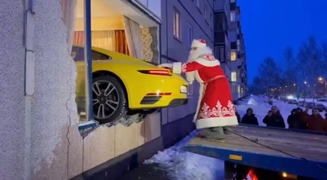 На втором этаже дома — большой пролом в стене. Через него в обычную квартиру медленно заезжает желтый Porsche 911 : видна мебель, ковёр, шторы, уютная жилая комната. Машина движется плавно, с усилием, частично уже внутри квартиры.