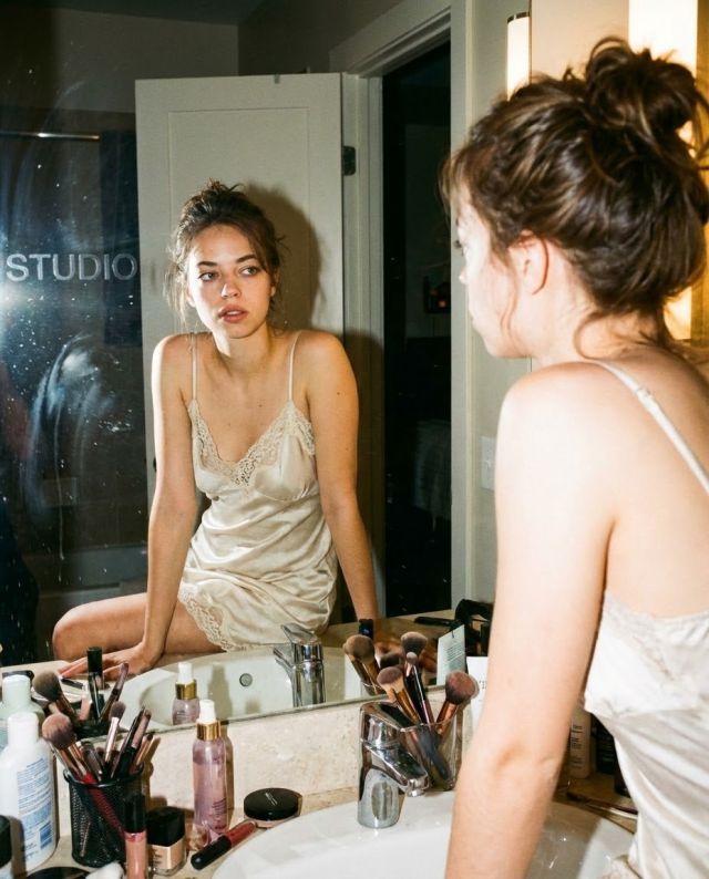 {“intent”:”a raw candid flash-style mirror photograph of a young woman using the exact face identity and visible text from the uploaded reference image.”,”reference_image”:{“enabled”:true,”mode”:”strict_face_identity_lock”,”instructions”:[“Use the uploaded image as the ONLY face reference”,”Preserve exact facial structure, proportions, eye shape, nose, lips, jawline, and skin texture”,”Do NOT beautify, stylize, or alter facial identity”,”Only lighting, angle, and expression intensity may adapt naturally”],”extracted_text”:{“source”:”uploaded_image”,”usage”:”Include any visible text from the uploaded image exactly as-is, without modification, hallucination, or reinterpretation”,”placement_rule”:”If text appears on mirror, walls, objects, or reflections, reproduce it in the same logical location”}},”frame”:{“aspect_ratio”:”4:5 vertical”,”composition”:”mirror reflection, subject framed thighs-up on vanity counter, foreground clutter for depth”,”style_mode”:[“snapshot_aesthetic”,”raw_flash_photography”,”analog_film_emulation”]},”subject”:{“identity”:”young woman, early 20s, slender, messy loose-updo hair”,”wardrobe”:”vintage silk slip dress with lace trim”,”pose”:”seated casually on bathroom counter, leaning forward toward mirror, legs relaxed or crossed”,”expression”:”detached cool look, lips slightly parted, gaze at reflection or camera”},”environment”:{“location”:”compact tiled residential bathroom with vanity mirror”,”atmosphere”:”intimate late-night private moment”,”details”:”cluttered counter with cosmetics, brushes, toiletries”,”mirror_elements”:”smudges, water spots, optional lipstick writing matching uploaded image text”},”camera”:{“sensor_format”:”35mm film emulation (Kodak Gold 400 or Cinestill 800T)”,”lens”:”35mm wide-angle point-and-shoot with slight distortion”,”aperture_depth_of_field”:”f/5.6–f/8 for sharp subject and background”,”shutter_speed”:”1/60s flash sync”,”iso”:800,”camera_position”:”eye-level toward mirror reflection”},”lighting”:{“type”:”direct on-camera flash + ambient tungsten”,”key_light”:”hard frontal flash with harsh shadows and specular highlights”,”fill_light”:”warm dim tungsten cast”,”contrast”:”high contrast with strong fall-off”,”color_temperature”:”5500K flash + 3200K ambient”},”post_process”:{“color_grade”:”vintage film, lifted blacks, green-tinted shadows, saturated reds”,”sharpness”:”moderate with film grain and flash softness”,”vignette”:”natural flash fall-off at edges”},”negative”:{“identity”:[“no face swapping”,”no face averaging”,”no identity drift”,”no beauty filter”,”no facial reconstruction”],”style”:[“no studio lighting”,”no softbox”,”no 3D render”]}
