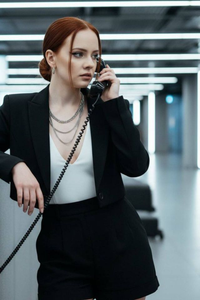 Создай фэшн-портрет девушки в современном общественном пространстве, девушка стоит, опираясь локтем на серую панель, держит у уха проводную трубку стационарного телефона, взгляд направлен в сторону, выражение лица холодное, уверенное и немного отстранённое, образ построен в чёрной монохромной палитре: структурированный укороченный жакет с острыми плечами, минималистичный белый топ с глубоким вырезом, высокие шорты, на шее многослойное серебряное колье, аккуратные серьги, причёска — гладко зачёсанные волосы, собранные в низкий пучок, пару прядей выпущенны спереди, макияж выразительный, чёткой графикой глаз и матовой кожей, фон — размытое интерьерное пространство с мягкими огнями и холодными оттенками, контраст между чёрным образом и серым объектом, искусственное освещение с лёгким кинематографичным зерном, умеренная глубина резкости, эстетика модной редакционной съёмки, настроение — сила, контроль, независимость.