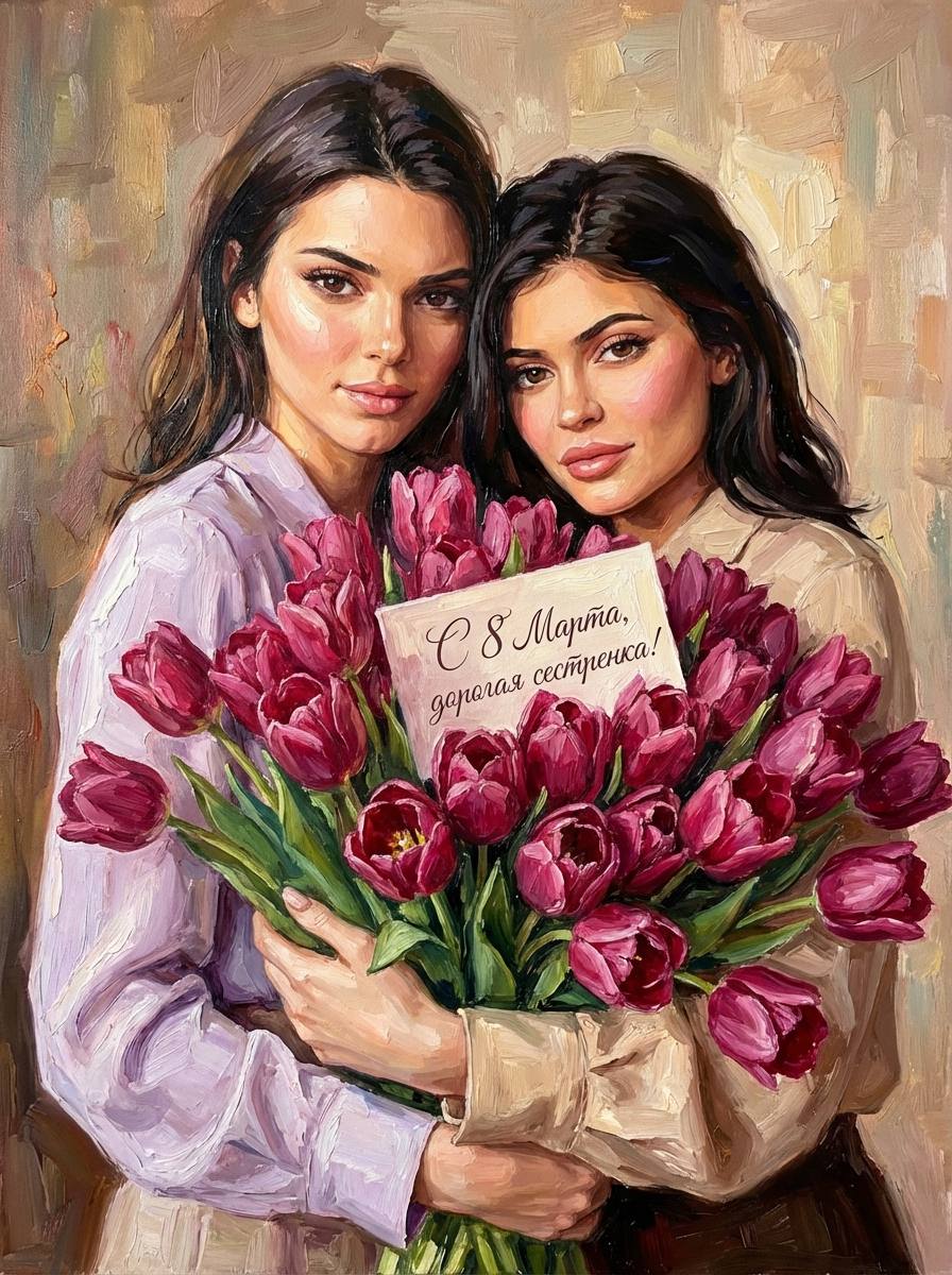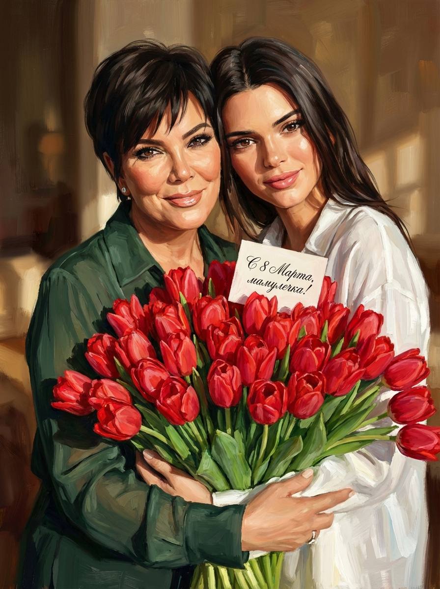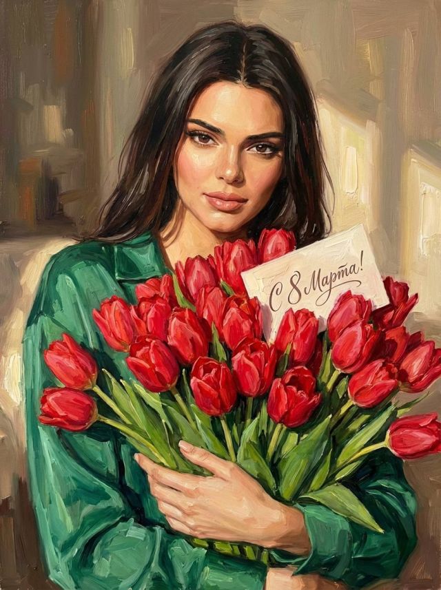 Схожесть 100%, не меняй черты лица. Гиперреалистичное, вертикальное фото – точная копия изображения из референса: девушка в изумрудной блузке легкой, обнимающая огромный букет красных тюльпанов. Стиль: густая масляная живопись с выраженными мазками (oil painting, heavy brushstrokes). Открытка вставлена в букет с тюльпанами. На открытке каллиграфическая надпись: С 8 Марта! Мягкий, солнечный свет, малая глубина резкости, создающая уют и тепло.