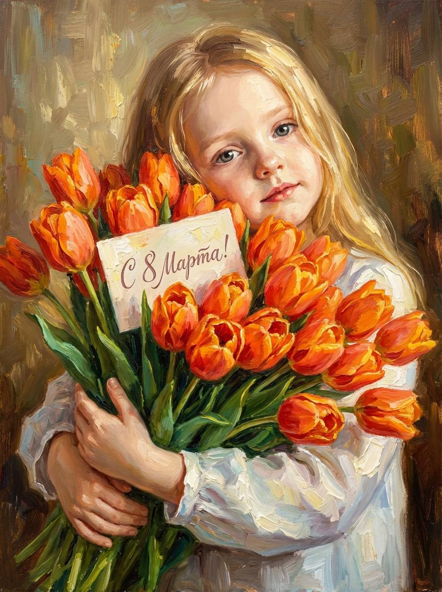 Стиль: густая масляная живопись с выраженными мазками (oil painting, heavy brushstrokes). Открытка вставлена в букет с тюльпанами.