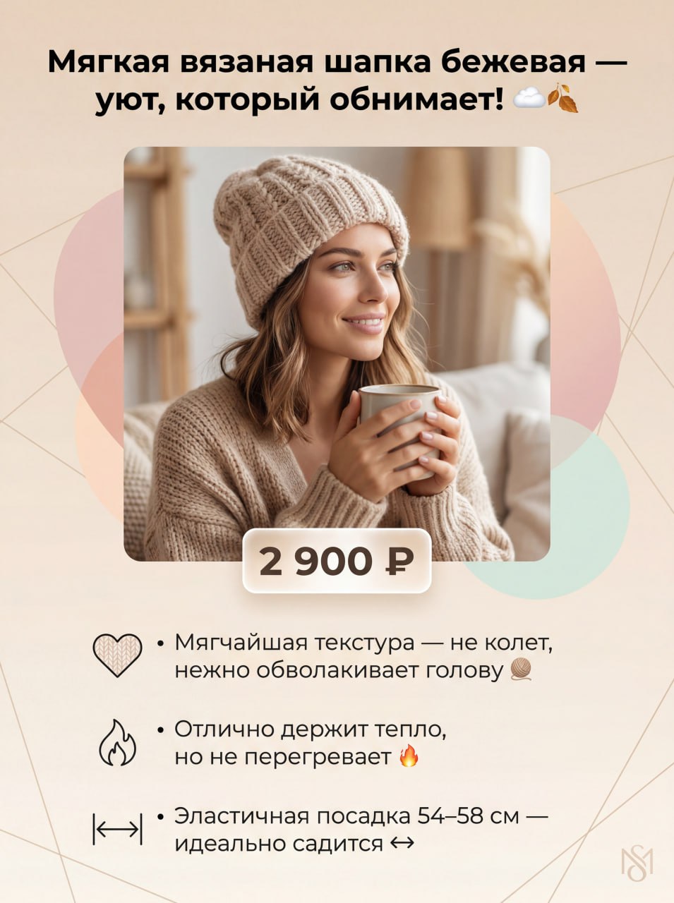 Ultra-realistic modern infographic product card for Ozon marketplace in vertical 3:4 aspect ratio, trendy minimalist asymmetric design, soft beige-to-cream gradient background with subtle thin geometric lines and abstract pastel shapes, no boring classic fonts — use bold contemporary sans-serif for headers and light elegant sans-serif for body text. Central large lifestyle photo in upper half: beautiful young woman 30-35 years old with natural makeup and soft smile wearing the soft beige knitted beanie, relaxed three-quarter view, warm cozy mood. Top bold header in large modern font: “Мягкая вязаная шапка бежевая — уют, который обнимает! ☁️🍂” Prominent price tag below photo in bold modern font with subtle glow: “2 900 ₽” Lower half: three evenly spaced bullet points with minimalist line icons (heart for softness, flame for warmth, stretch arrow for fit): • Мягчайшая текстура — не колет, нежно обволакивает голову 🧶 • Отлично держит тепло, но не перегревает 🔥 • Эластичная посадка 54–58 см — идеально садится ↔️ Subtle brand watermark in corner, premium fashion catalog aesthetic, ultra-sharp 8K detail, clean high-end e-commerce infographic style, portrait orientation 3:4 aspect ratio