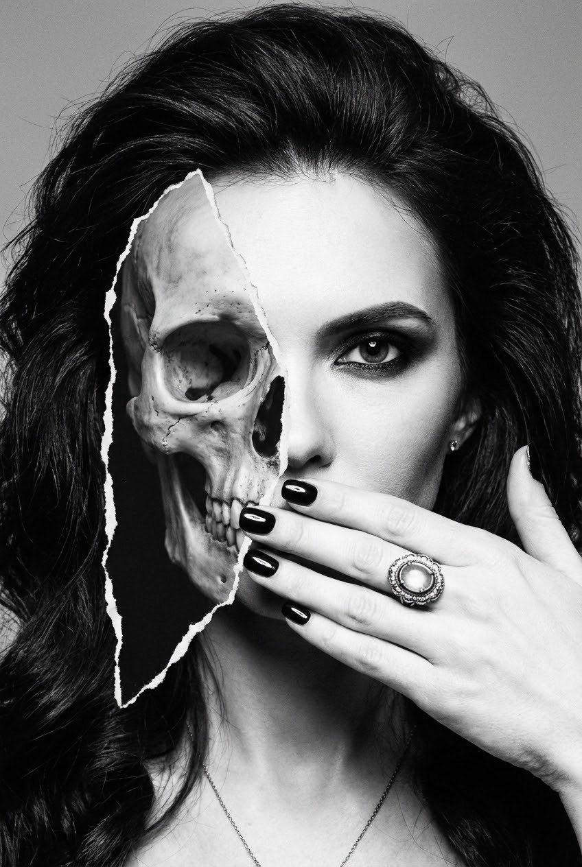 A high-contrast black-and-white studio fashion portrait of a glamorous woman, close-up head-and-shoulders. Her hair is voluminous and swept back, smoky dark eye makeup, one visible eye staring at camera. Her hand covers her mouth with glossy black nail polish, wearing a large vintage statement ring (round center stone with a halo/ornate setting) and a delicate necklace chain. The left half of the portrait is a torn-paper collage reveal: beneath the ripped edge is a detailed human skull aligned to her face (half skull, half woman), surreal gothic duality. Dramatic lighting, sharp detail, film grain, vintage editorial look, minimal background.