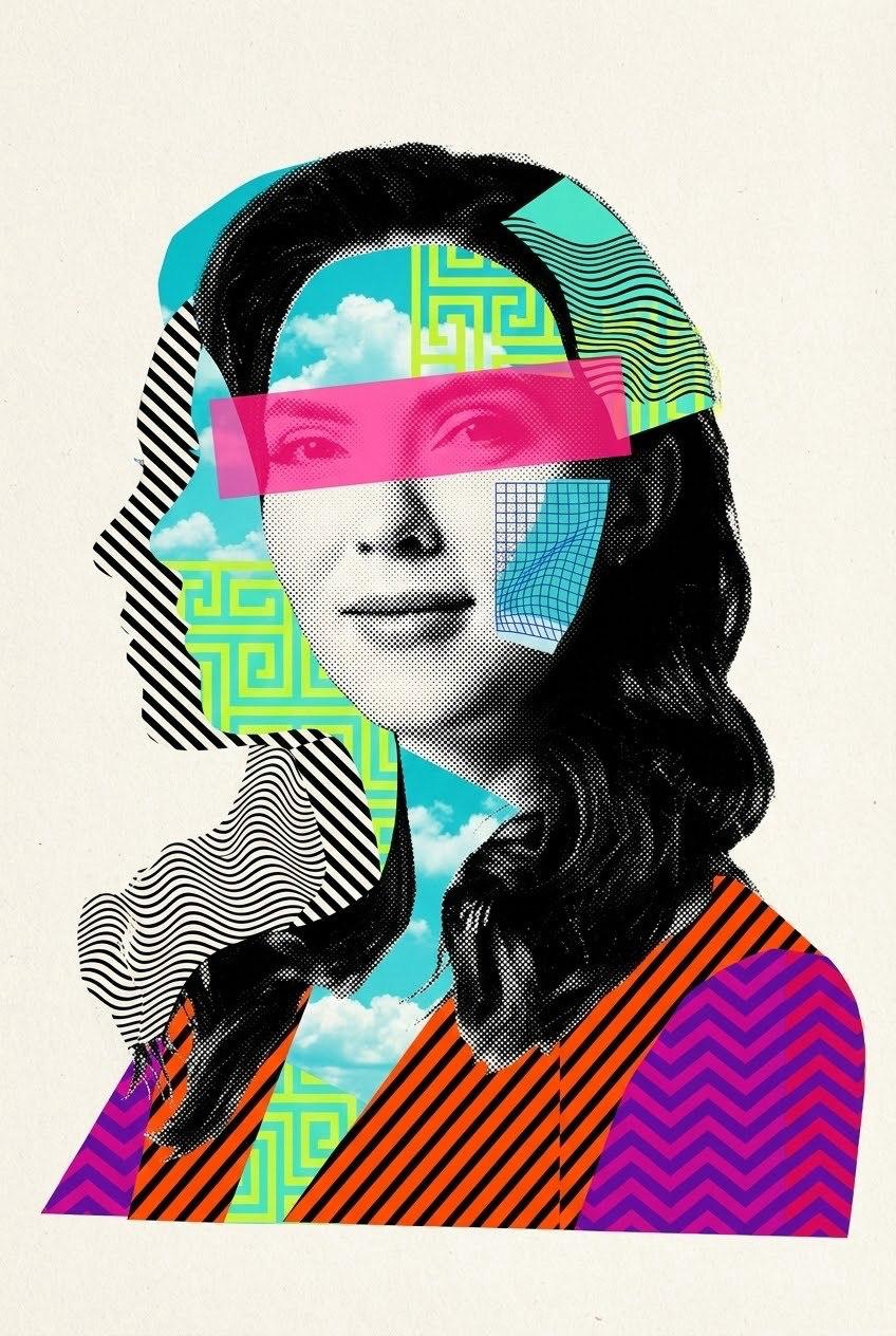 A vertical mixed-media collage poster on an off-white textured paper background. A woman from reference photo bust/portrait (head and shoulders) faces forward, slightly turned right, with black hair and a calm neutral expression. Her face is rendered in black-and-white halftone (newspaper dot) texture. A hot-pink translucent rectangle runs horizontally across her eyes like a censor bar. Her silhouette is filled with layered graphic fragments: cyan/teal sky-with-clouds texture, a lime/yellow geometric maze pattern, black-and-white diagonal stripes, a small blue wireframe grid patch, and black wavy line patterns. On the left side of her head is a cut-out profile silhouette (a missing chunk) revealing more striped/wavy textures behind it. Clothing area has bright orange with diagonal stripes and purple/magenta chevron pattern accents. Overall vibe: modern pop-art / screenprint / editorial collage, crisp edges, high contrast, limited palette (teal/cyan, lime, pink, orange, black, white).