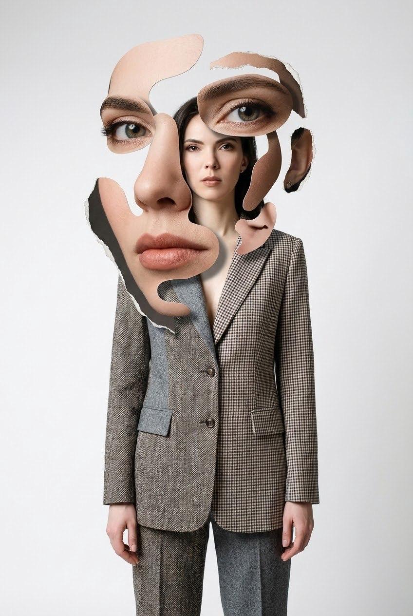 Surreal high-fashion editorial collage portrait of a model standing full-body against a clean light gray/white studio background. She wears a tailored suit with mixed textures (checkered blazer, tweed/gray suit pieces), hands at her sides, neutral serious expression. Over her body is an abstract paper-cutout face assemblage: oversized photoreal eyes, a large nose and lips, and irregular organic cutout shapes layered like a mask, with torn-paper edges and collage shadows. Cubist / Dada photomontage style, disjointed facial fragments, strong graphic composition, sharp detail, magazine editorial lighting, high-resolution, contemporary art fashion spread.