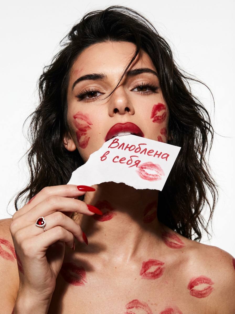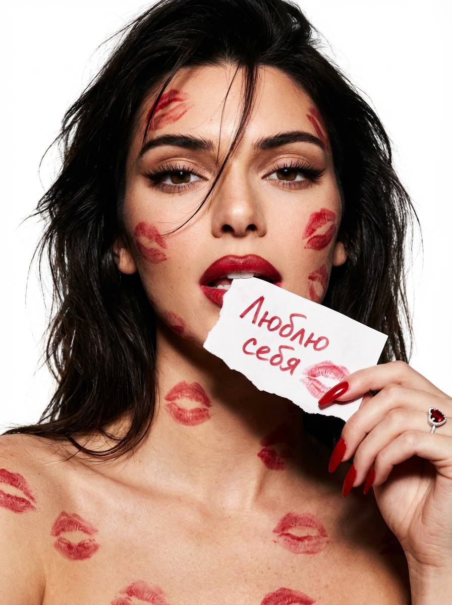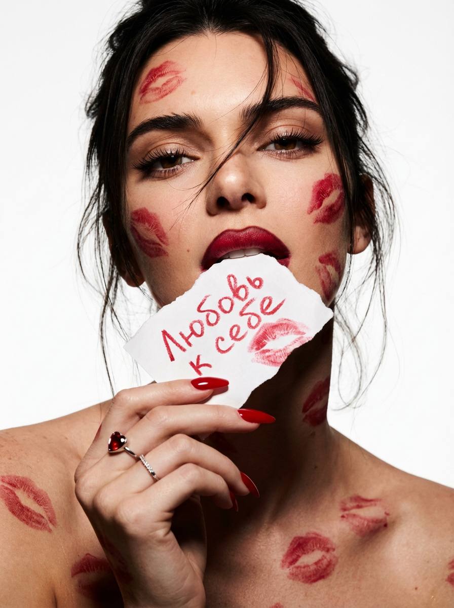 Не меняя внешность, сходство 100%. Фотореалистичный портрет крупным планом, кинематографическая вспышка Y2K. Чистый белый фон, эффектное профессиональное освещение сверху с глубиной и рельефными тенями. Голова поднята, камера находится на уровне глаз, взгляд проницательный, страстный и томный. Естественная небрежная прическа с легким объемом и свободными прядями, обрамляющими лицо. Выразительный лисий глаз только во внешних уголках, подчеркнутые ресницы, насыщенная красная помада с более темным контуром по краям. Она кусает зубами грубо оторванный листок бумаги, держа его за уголок; на бумаге красной помадой написаны слова “Любовь к себе” и виден отпечаток поцелуя. Хаотичные следы поцелуев красной помадой на лице, шее, плечах. Белое серебряное тонкое кольцо с большим красным камнем сердцем. Красные длинные безупречные ногти.