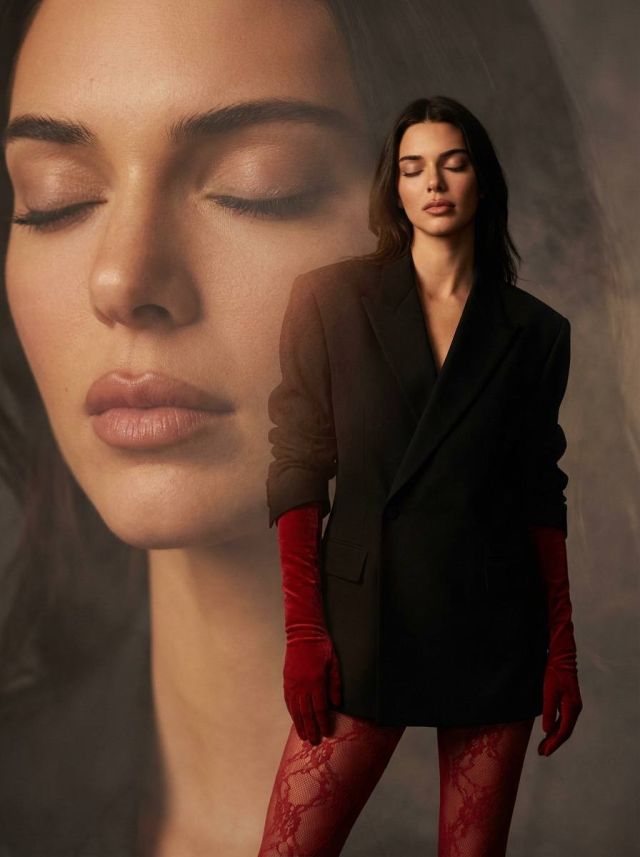 Создай реалистичный портрет красивой женщины, не меняя черты лица: длинные волнистые волосы, насыщенно красные кружевные колготки, черный оверсайз пиджак, красные высокие перчатки в цвет колготок, мягкое кинематографическое освещение, чувственная поза с закрытыми глазами, дымчатый фон, композиция с двойной экспозицией (лицо крупным планом сзади, портрет в полный рост спереди), студийная фотография высокого разрешения, насыщенный контраст, тонкая текстура кожи, реалистичные тени и блики, художественная глубина резкости, фотореалистичный стиль.