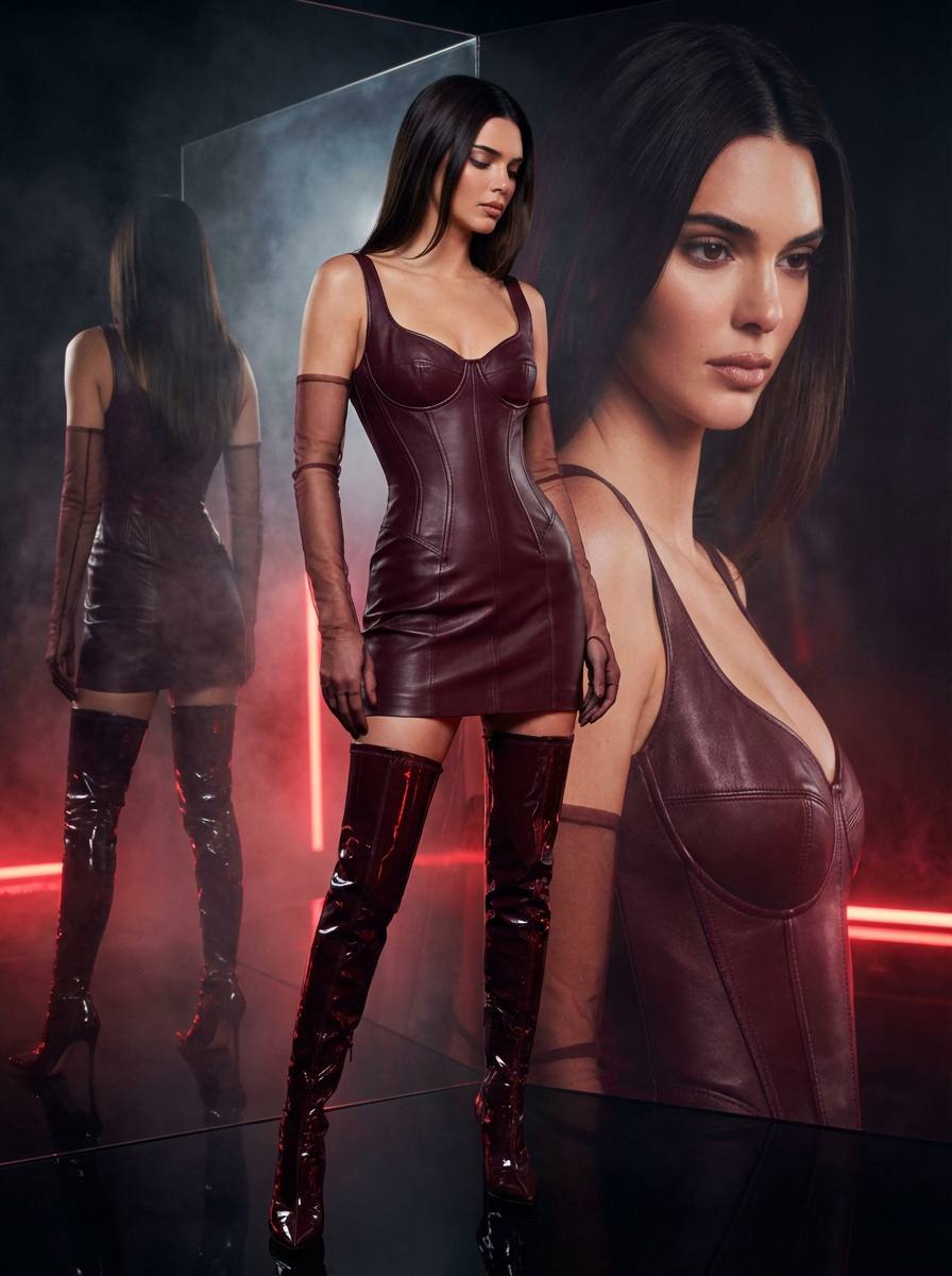 Создай ультрареалистичный портрет элегантной женщины, сохраняя её черты лица: длинные гладкие тёмные волосы, кожаное корсетное платье глубокого бордового цвета, прозрачные перчатки до локтя, высокие лакированные сапоги. Она стоит в пол-оборота, слегка наклонив голову, взгляд направлен вниз.