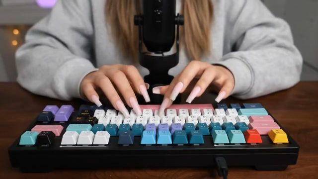 Видео начинается в уютной ASMR-студии, где создательница контента сидит за столом с микрофоном перед собой. Она энергично печатает на механической клавиатуре, издавая отчетливые, громкие щелчки клавиш. Камера фиксирует крупный план её рук, плавно следя за движением пальцев и ударов по клавишам, подчёркивая ритм и тактильность.