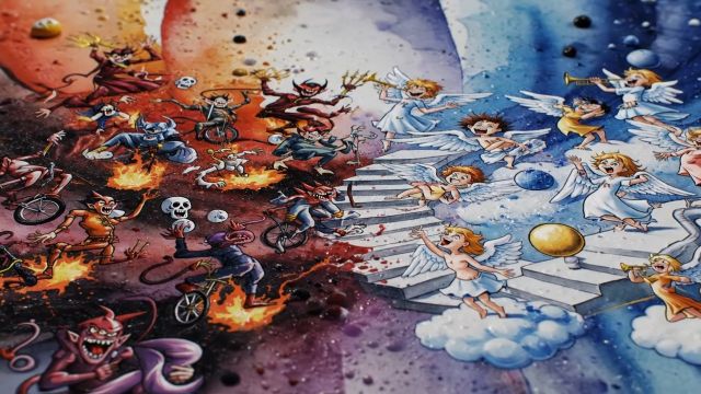 Сцена представляет собой сюрреалистический и комичный мир: композиция «Highway to Hell / Stairway to Heaven» с наложением двух миров — ангелов и демонов, полу-реалистичный аниме-стиль, смешной и причудливый.