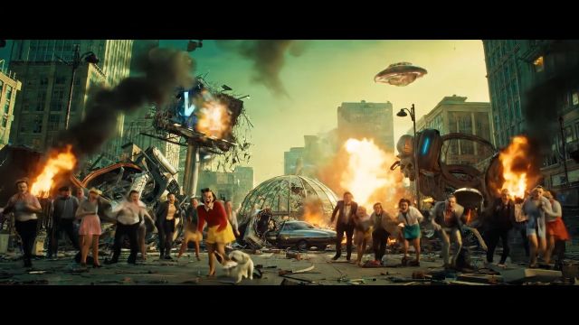 Видео открывается с широкого слегка наклонённого кадра городской площади, охваченной хаосом, под болезненно-зелёно-жёлтым небом в стиле 1950-х, напоминающим Mars Attacks!. Камера фиксирует паническую толпу жителей в винтажной одежде — юбки-пудели, очки в роговой оправе, блестящие костюмы — все разбегаются в разные стороны, лица искажены гипертрофированным ужасом. Кто-то спотыкается о завалы, кто-то кричит вверх, а женщина роняет маленькую собачку, которая в комическом паническом виде лает.