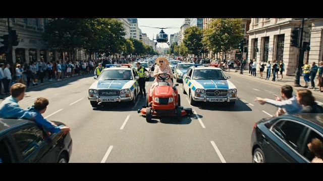 Кинематографичная забавная погоня: 97-летняя женщина, управляющая маленькой красной газонокосилкой в центре Лондона, полицейские машины с мигающими огнями медленно следуют позади, вертолет зависает в воздухе, пробка с озадаченными водителями, которые указывают и смеются, газонокосилка маневрирует между полосами со скоростью 8 миль в час, мультяшный, но реалистичный стиль, яркий дневной свет, динамичные широкоугольные кадры, камера отслеживает сверху, затем крупный план женщины, кричащей на русском «да идите #@*%& я просто катаюсь что вам от меня нужно!», юмористический документальный тон, 16:9