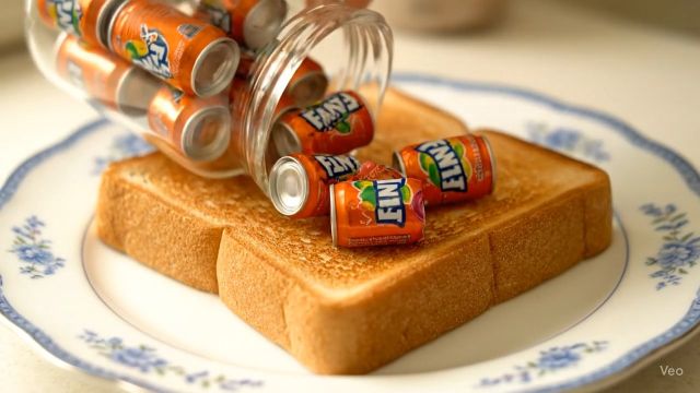a glass cookie jar filled [miniature orange cans of fanta] is tilted on top of a freshly toasted bread piece on a fine china blue and white plate. Where the [miniature orange cans of fanta] are dropped from the jar onto the toast and then spread by using a metallic smooth butter knife, the [miniature orange cans of fanta] are spread onto the toasted bread. The same way that butter would be spread, but it’s a mixture of the colors of the [miniature orange cans of fanta] cola. All of the contents of the jar must be put onto the bread and fully spread. The room is nicely lit up and the result should be very ASMR and enjoyable to watch, whilst also making it realistic as it can possibly be. Inside the jar are [miniature orange cans of fanta]