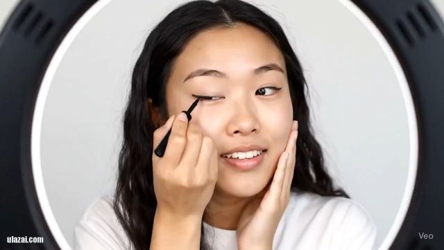 “description”: “beauty vlogger showing a perfect eyeliner tutorial from scratch with no pre-applied makeup on eyelids”,