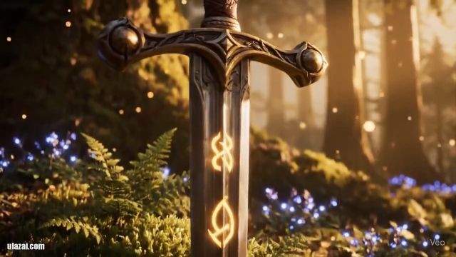 Небольшие растения и папоротники слегка покачиваются, создавая ощущение живого, волшебного леса. Звуковая дорожка наполнена глубоким, низким магическим гулом, синхронизированным с пульсацией рун меча, с тонкими хоральными оттенками, создавая атмосферу мистики и величия. Камера медленно проходит по всему мечу, раскрывая его детали и окружение, создавая ощущение древней силы и магии леса.