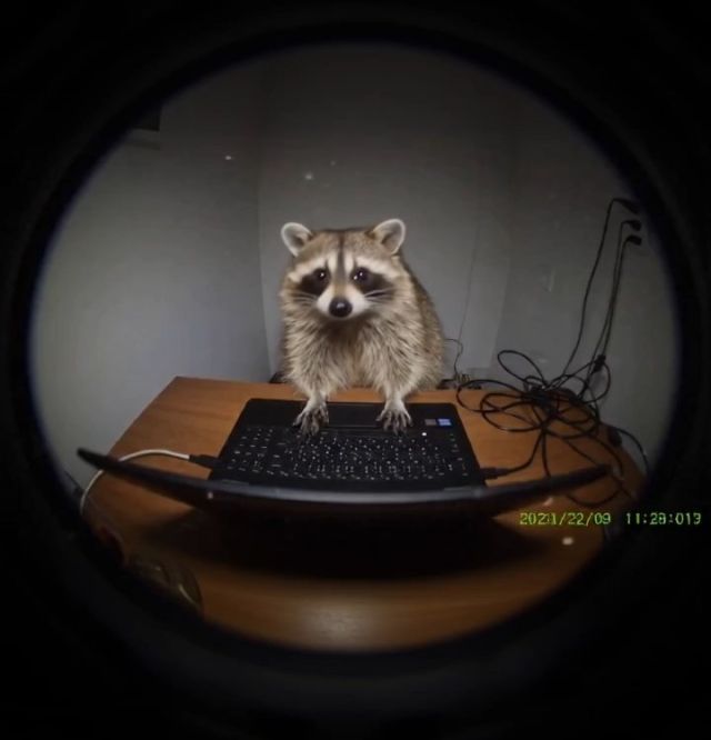 A CCTV-style surveillance footage of a raccoon sitting in a small room, using a laptop. The camera angle is from the top corner of the room with a fisheye lens distortion. The scene looks grainy and low-resolution, as if captured by an old security camera. The raccoon looks confused or intensely focused, typing on a keyboard. The room is dimly lit, with a slightly messy desk and cables. Vertical , Realistic style, security footage aesthetic, slight blur and timestamp and date overlay.
