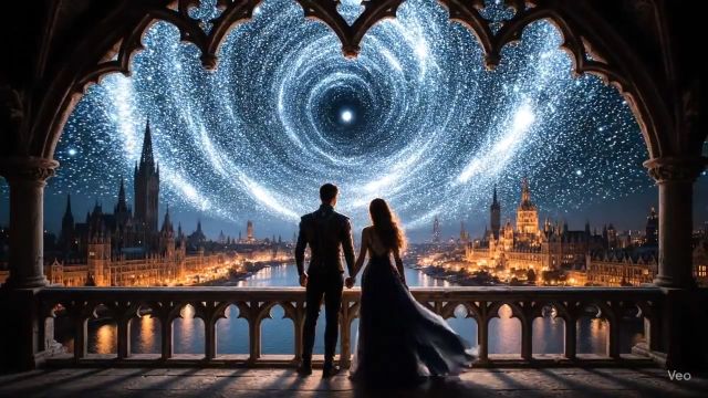 “An 8-second, hyper-realistic, and magical sequence of a couple on a balcony overlooking a vast fantasy city as a river of stars awakens in the night sky.”,