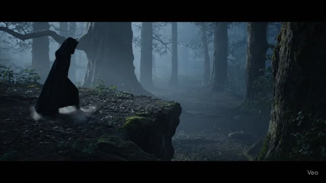 Видео начинается в лесу, окутанном туманом на сумерках, где в плаще фигура спокойно идёт к краю утёса, будто земля внезапно обрывается.
