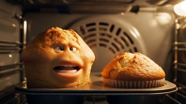 A playful, cinematic close-up of two muffins rising and browning inside a warm oven. The first muffin, slightly tilted toward the second, exclaims excitedly: ‘I can’t believe this Veo 3 thing can do dialogue now!’ The second muffin reacts with wide-eyed shock, shouting: ‘AAAAH, a talking muffin!’ The muffins jiggle gently as they bake, tiny steam wisps rising, with realistic browning and texture changes. Soft oven glow illuminates the scene, highlighting the muffins’ golden tops. The camera holds a steady close-up while capturing the subtle movement of rising batter and comedic expressions. Ambient oven sounds—the gentle hum of heat, occasional pops—complement the dialogue. The scene is humorous, lively, and visually detailed, with exaggerated personality given to the muffins, making it feel like a short animated ASMR sketch.