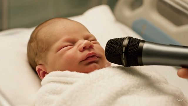 Camera: medium close-up shot, steady TV-style, focusing entirely on the baby’s face and microphone.