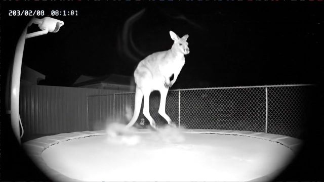 The tone is uncanny but grounded — like genuine night-vision footage of a kangaroo caught on camera bouncing naturally and energetically on a trampoline.