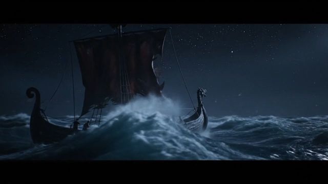 Видео открывается с темного, бурного океана ночью, где гигантские волны бьют о старый деревянный викингский корабль, его паруса изорваны, а мачты трещат под ударами ветра. Небо черное, вспышки молний периодически освещают сцену, создавая зловещий свет на воде и корабле.