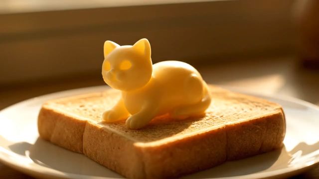 В центре тоста сидит милый котёнок, полностью сделанный из мягкого сливочного масла. Его форма очаровательна — округлые ушки, лапки вытянуты вперёд, текстура блестит и переливается под солнечными бликами, как настоящий слой масла.