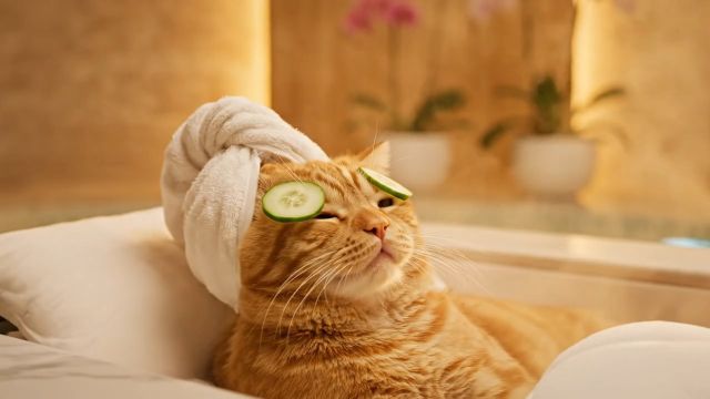 Кот выглядит полностью блаженно довольным, на голове аккуратно обёрнут маленький белый полотенце-турбан, на закрытых глазах лежат свежие ломтики огурца. Кот слегка откидывается назад, когда руки спа-администратора нежно массируют плечи, а шерсть кота слегка взъёривается, подчёркивая расслабление.
