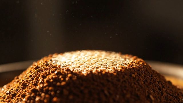 Видео открывается с гиперреалистичного макро-кадра, зафиксированного статичной камерой, которая обеспечивает экстремальное приближение к поверхности кофейной насыпи. Основной объект — идеальная капля воды, сверкающая на свету, которая медленно падает на грубые свежемолотые кофейные зерна. Зерна демонстрируют богатую палитру коричневых оттенков, каждая гранула чётко различима.