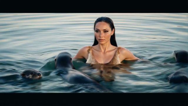 Она плывёт среди группы выдр. Камера фиксирует полный рост, подчёркивая её силу и гармонию с природой. Животные свободно скользят рядом, и в один момент одна выдра подплывает ближе, слегка касается её лица и будто целует её.