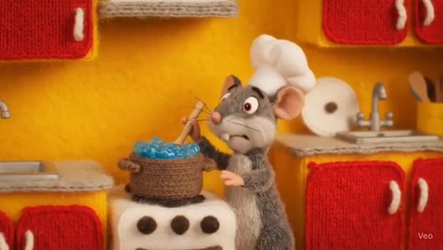 Крыс стоит на табурете перед игрушечной плитой и энергично мешает деревянной ложкой пузырящийся котелок. Его движения нервные и торопливые, а голос дрожит от напряжения, когда он бормочет по-португальски: «Só mais um pouquinho… ‘essência de sabor’, como diz a receita.» Атмосфера напоминает мультфильмы студии Pixar, но с очарованием ручной анимации из ткани.