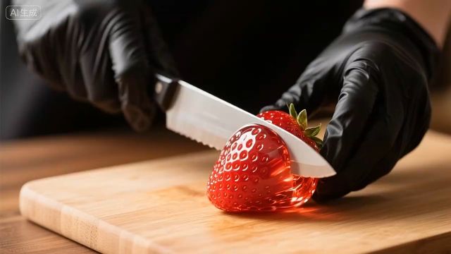 Видео начинается с крупного плана гладкого прозрачного стекла, аккуратно вырезанного в форме клубники. В центре кадра стеклорез с тонким блестящим лезвием медленно скользит по поверхности стекла, оставляя ровную, тонкую линию. Камера фиксирует мельчайшие детали: легкое мерцание прозрачного материала, отражения мягкого теплого света на гранях стеклянной клубники, прозрачность и тонкость текстуры.
