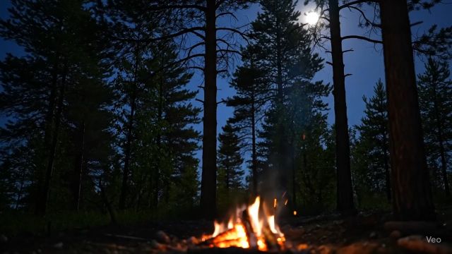 Широкоугольная реалистичная 4K съемка на уровне глаз. В кадре — высокий сосновый лес при лунном свете, в центре медленно пульсирует огонь камина, раскаленные угли искрят и поднимаются вверх. Легкий ветерок колышет иголки деревьев, создавая мягкий шелест. В стереозвуке слышны мерный стрекот кузнечиков, шипение и потрескивание смолистых дров, изредка доносится отдаленный уханье совы. Камера фиксирована, кадр плавно повторяется в зацикленном виде, позволяя наблюдать за мерцающим светом углей и наслаждаться многослойным, успокаивающим ASMR-звуковым сопровождением, идеально подходящим для сна и релаксации.