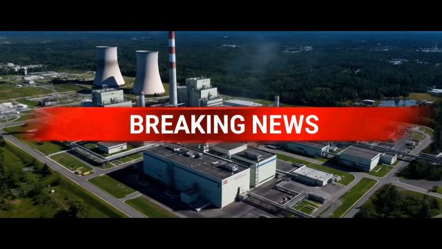 Кинематографическая сцена экстренного новостного эфира. Красная вспышка «BREAKING NEWS» прерывает обычное вещание. Экран переключается на прямой аэрофотосъёмку атомной электростанции: мощный взрыв разрушает один из реакторных блоков. Сильная белая вспышка сменяется огненным шаром, ударной волной и стремительно поднимающимся грибовидным облаком. Камера дрожит и искажается от силы взрыва.