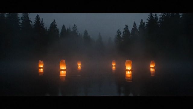 Видео открывается спокойным, кинематографичным кадром туманного озера. На гладкой поверхности воды медленно плывут шесть фонарей, образуя широкий круг. Их тёплый свет мягко мерцает, отражаясь в воде, где каждое отражение слегка дрожит в лёгком тумане.