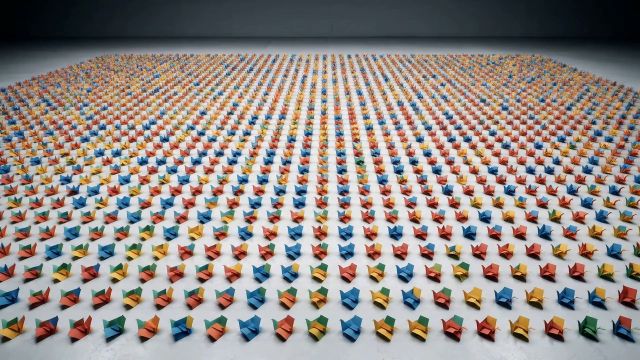 Через пять–шесть секунд процесс завершается: каждый квадрат превращён в идентичную сложную оригами-фигуру — изящных журавлей с расправленными крыльями, многолепестковые лотосы или миниатюрные детализированные драконы. В последние две–три секунды все фигурки, всё ещё зависшие в воздухе, плавно и быстро выстраиваются в единый крупный трёхмерный узор или узнаваемый мозаичный образ: гигантский парящий шар из тысяч маленьких птиц, сложная волна из цветов или пиксельно точное трёхмерное изображение лица или символа.