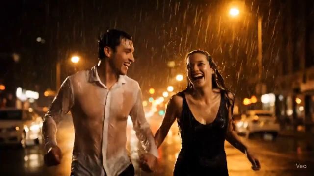 “An 8-second, hyper-realistic, and romantic sequence capturing a couple’s spontaneous and joyful run through a city downpour at night, filmed with intimate, dynamic camera movement.”,