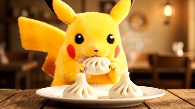 “description”: “Cinematic horizontal video of Pikachu sitting at a wooden table with a plate of steaming khinkali (Georgian dumplings). Pikachu looks fluffy, realistic and expressive. First Pikachu carefully holds one khinkali with both paws, sniffs it with curiosity, then takes a realistic bite. The bite looks natural — the dumpling breaks open slightly, steam and juice come out. Pikachu chews with small subtle mouth movements, eyes sparkle happily, and then he smiles with satisfaction. Other khinkali remain on the plate, also steaming.”,