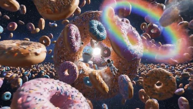 Видео начинается с непрерывного кадра в стиле «одним дублем», где камера совершает невозможные движения: вращается, крутится и летит сквозь бесконечную галактику гигантских плавающих пончиков, вращающихся как планеты. Камера стартует внутри огромного светящегося пончика с расплавленным шоколадным центром, проходит сквозь капающую глазурь и вырывается в открытый космос, где тысячи разноцветных пончиков плавают словно астероиды, а посыпка сверкает как созвездия. Камера пролистывает сквозь кольца пончиков с фростинговыми «аврорами», пролетает через станцию в форме пончика, где астронавты парят в невесомости, поедая пончики. Затем камера вращается среди неоновых пончиков с джемовой начинкой, светящихся как пульсары, облетает гигантские чашки кофе, вращающиеся как луны, с паровыми следами, формирующими галактики. Финальный план — камера поднимается, открывая колоссальный пончик, заслоняющий звезду, с глазурью, отражающей космический свет, а вселенная наполнена бесконечными вкусными пончиками. Плавные переходы, динамическое движение, кинематографическая научно-фантастическая атмосфера, 8K ультрареализм, детализированная визуализация, эпические VFX.