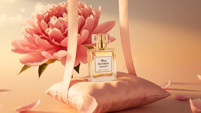 “motion”: “flower floats and opens; bottle is lifted by ribbons; petals drift as light warms the background”,