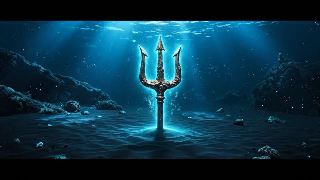В центре кадра обнаруживается гигантский бронзовый трезубец, наполовину погружённый в песок. Он начинает гудеть и светиться ярким аквамариновым светом, притягивая взгляд и создавая ощущение необузданной силы.