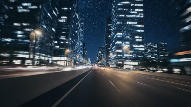 One-shot rotating camera flies down a midnight highway between towering skyscrapers, lights blurring into streaks. As it spins sideways, it reveals reflections in building glass, then turns upward into the stars above.Sound: engines passing, urban wind, low synth pulse.Style: sleek urban speed, dreamlike, high-gloss realism
