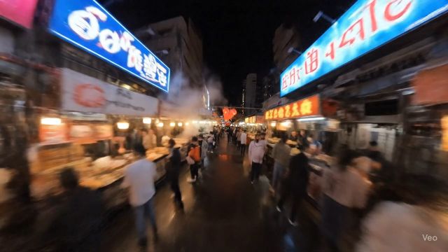 “description”: “Fast-paced FPV-style drone video weaving dynamically through a crowded night market. Neon signs flicker above bustling stalls, steam rises from sizzling street food, and camera executes barrel rolls beneath red lanterns. The perspective swoops upward mid-shot, revealing the full city skyline glowing under night lights. Motion blur accentuates speed and fluidity, while a dramatic synth-wave soundtrack builds tension.”,