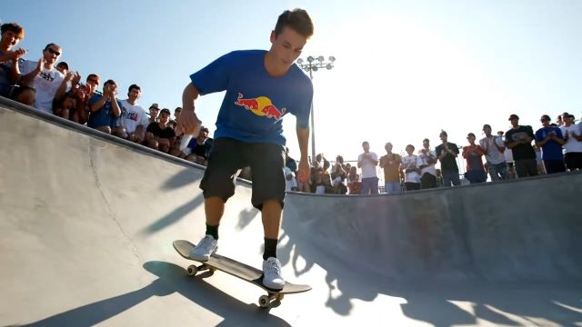 Финальный кадр — скейтер приземляется идеально чисто, расправив крылья во всю ширину. Толпа взрывается аплодисментами и криками. Камера делает плавный отъезд, в руке скейтера на мгновение отчётливо видна банка Red Bull с логотипом, подсвеченная солнечным бликом.